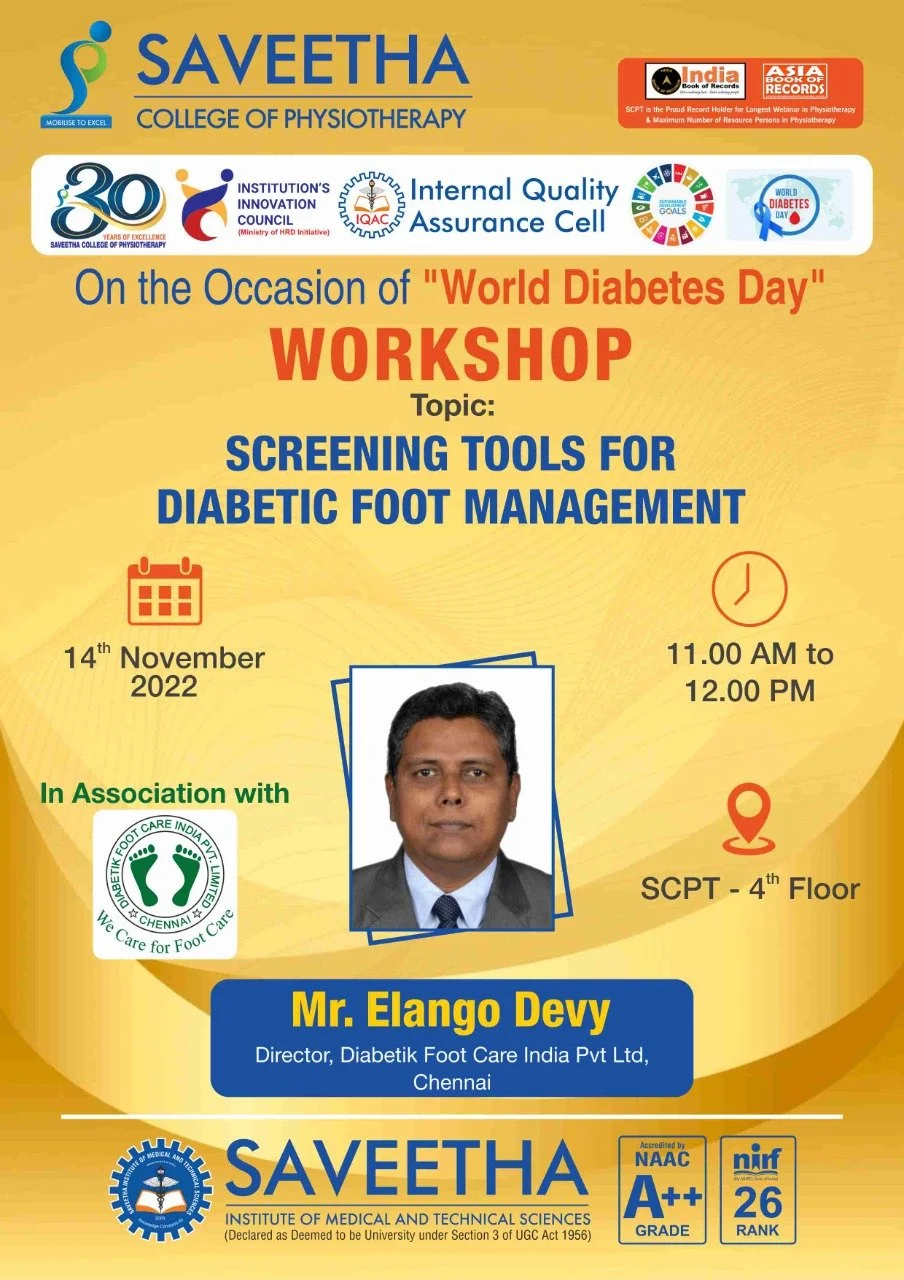 Saveetha College of Physiotherapy (map) Saveetha Nagar Kuthambakkam, TN, 600124 India ✚ gCal ✚ iCal In Association With Diabetic foot care India PVT Limited