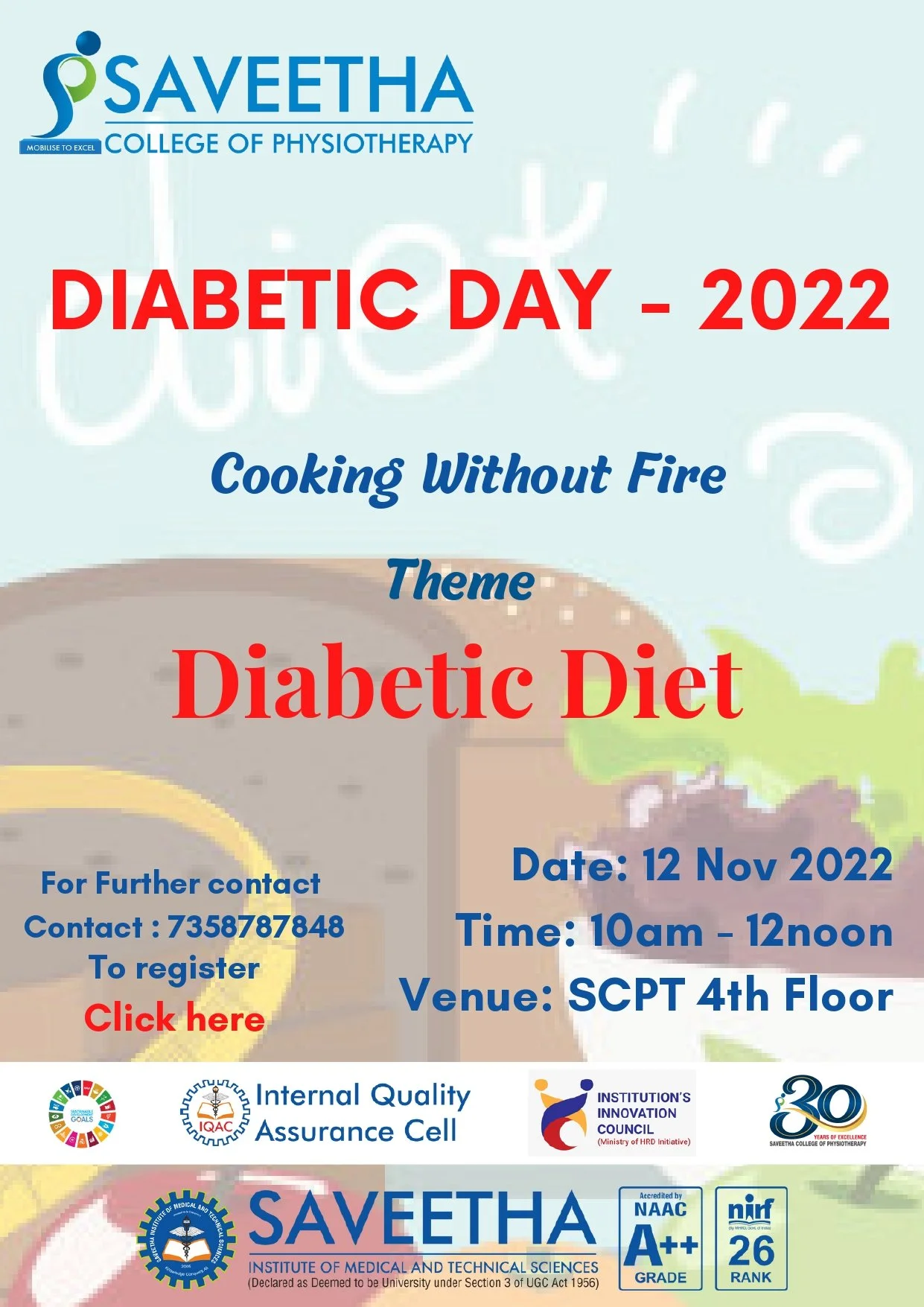 Saveetha College of Physiotherapy (map) Saveetha Nagar Kuthambakkam, TN, 600124 India ✚ gCal ✚ iCal On the Occasion of World Diabetic Day - 2022Event Cooking Without FireTheme: Diabetic Diets Click here to register