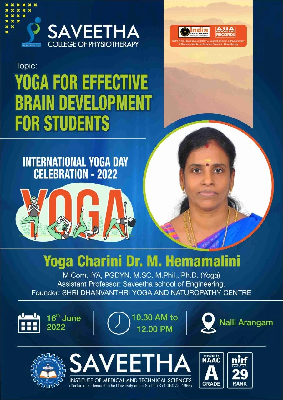 Saveetha College of Physiotherapy (map) Saveetha Nagar Kuthambakkam, TN, 600124 India ✚ gCal ✚ iCal Yoga Day Celebration