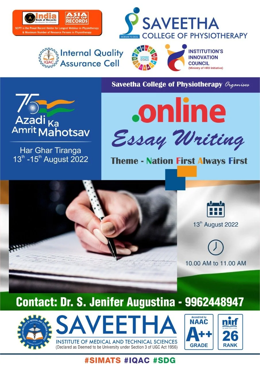 Saveetha College of Physiotherapy (map) Saveetha Nagar Kuthambakkam, TN, 600124 India ✚ gCal ✚ iCal Nation First Always First